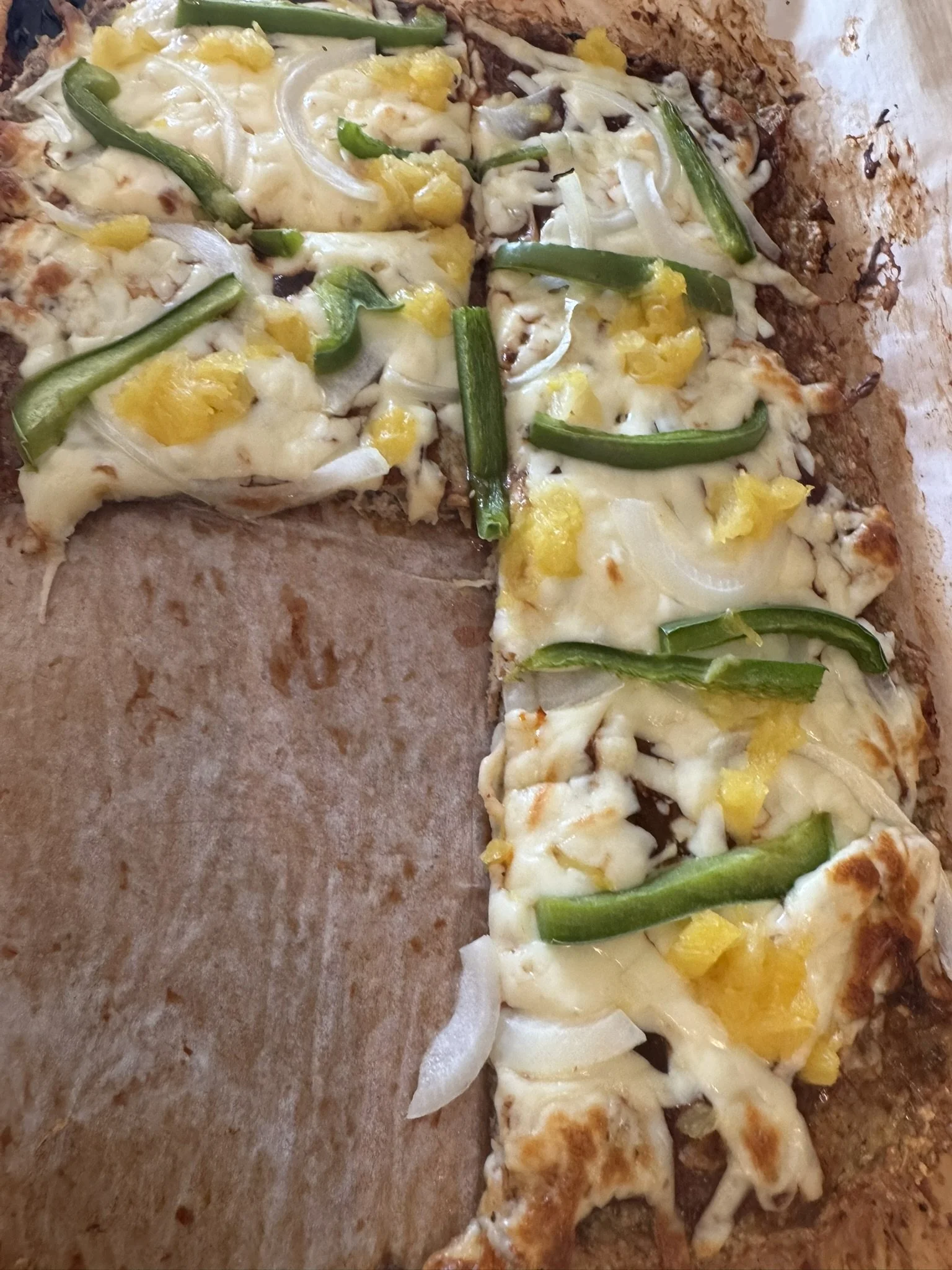 I topped mine with what I had on hand, onion, green pepper, some pineapple. I even added some red pepper flakes once the BBQ sauce was on.